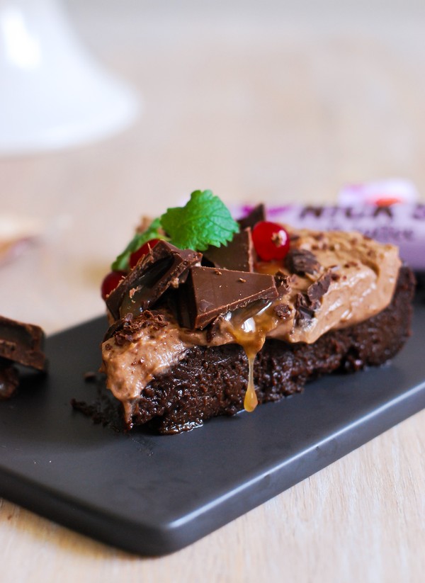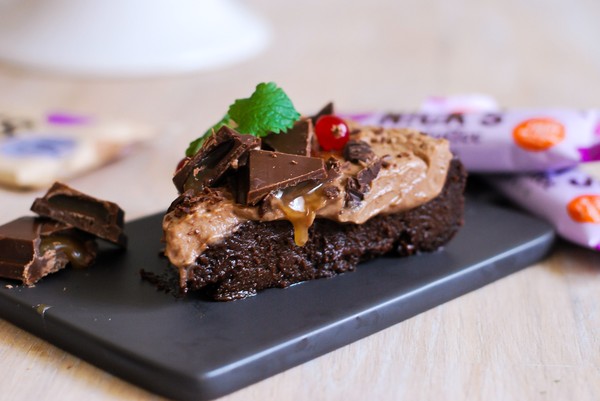 Jag toppar min lyxiga kladdkaka med bitar av Soft Toffee, hackad choklad, bär och några blad citronmeliss!